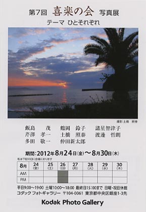 | 2006年9月に、東京読売写真クラブ会員の中で気心のあった仲間10人が気楽に写真を楽しもうと集まったサークル(会名称 喜楽の会)です。プロの写真家の指導者はおりませんが、年に一度テーマを決めて写真会の開催、展示会作品の写真集作成及び、1・2度の撮影会を行っています。写真展は今回で7回目になります。第6回目まで、ひと・旅・の出会い・しあわせ・彩華・四季折々・などの多種多様のテーマで開催してきました。現在は8人で活動中です。 |